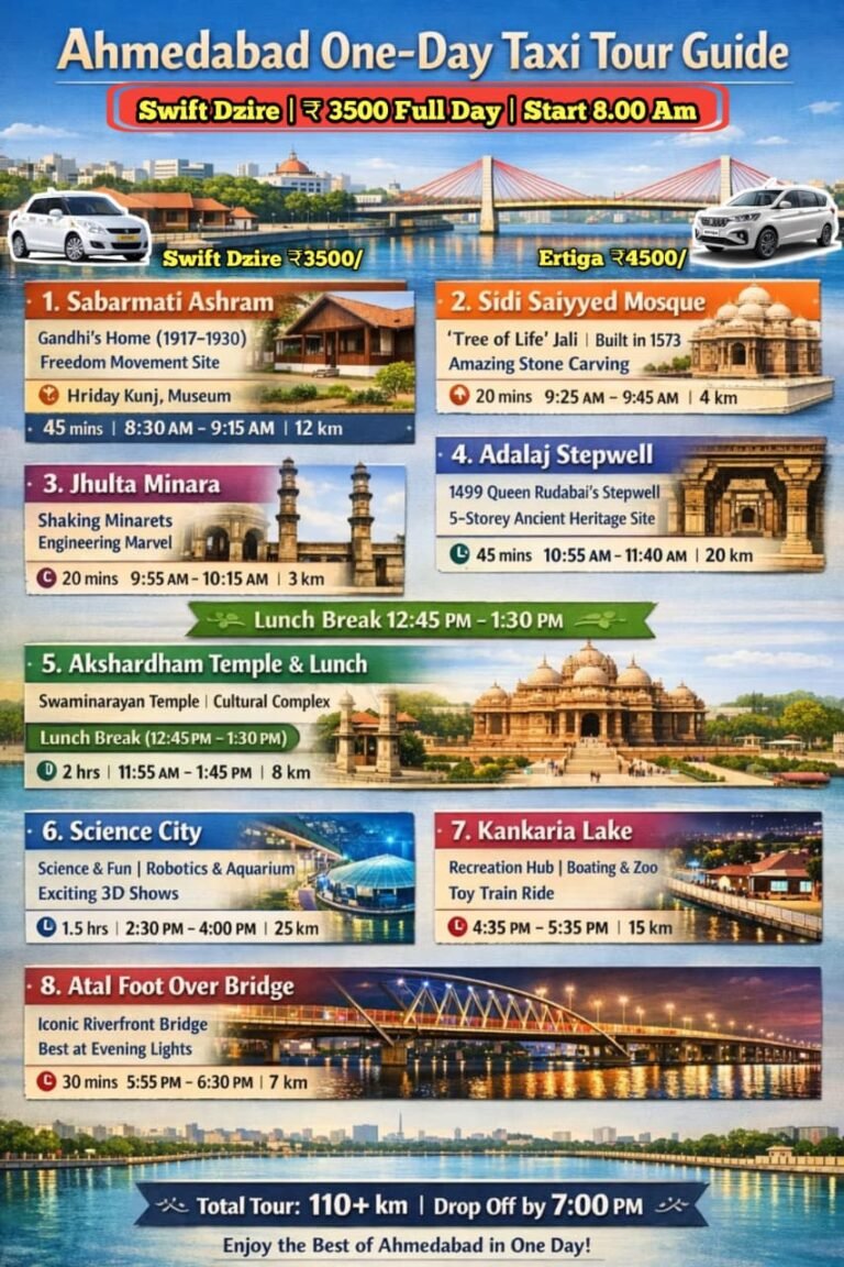 We proudly serve all major connecting cities across Gujarat, including Bhuj, Gandhidham, Jamnagar, Porbandar, and Somnath, along with popular tourist destinations like Dwarka, the Statue of Unity, Mount Abu, and Abu Road. From business travel to family trips and leisure journeys, our well-maintained vehicles and experienced drivers ensure stress-free transportation tailored to your needs.